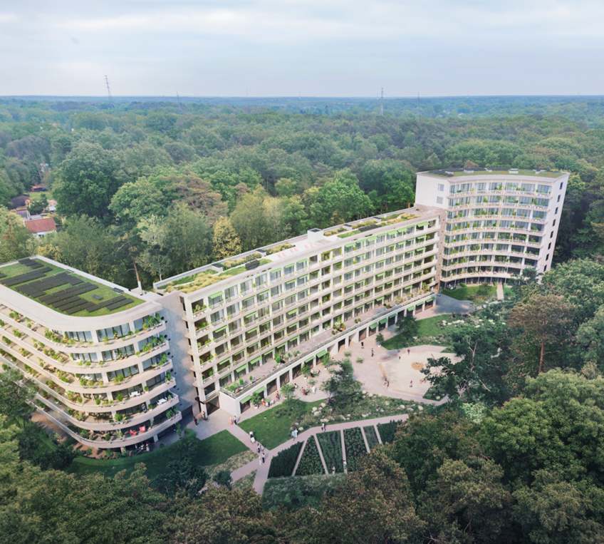 Bosart reconverteert een voormalig zorgcentrum naar 70 BEN-appartementen. Nieuw, duurzaam aanbod in een groene omgeving is beperkt in Genk, wat de waardevastheid op lange termijn versterkt.